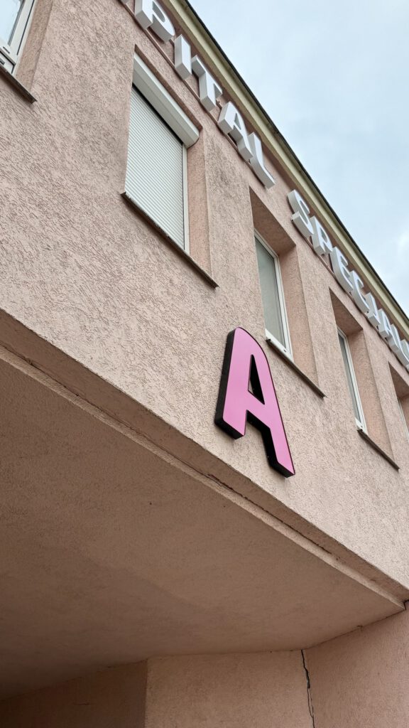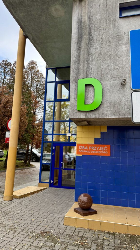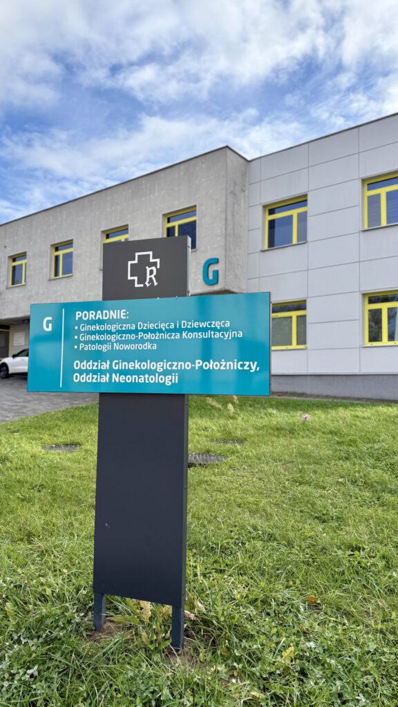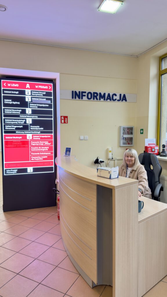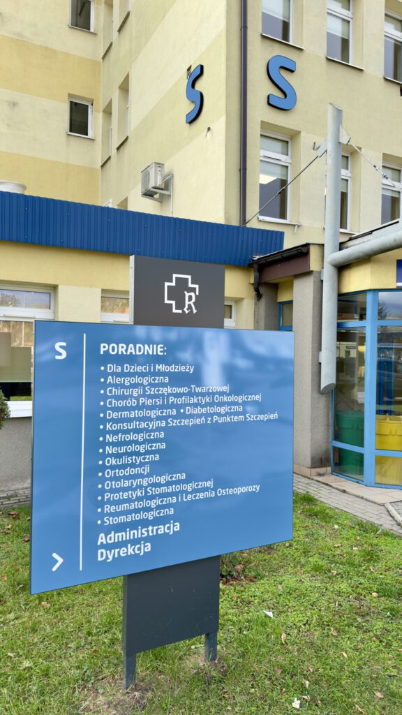 Nowe oznaczenia pojawiły się zarówno przy wejściu głównym, jak i w budynkach poradni. W głównym holu, tuż obok punktu informacji, zamontowano podświetlany pylon wskazujący kierunki do poszczególnych oddziałów. W budynku Poradni Specjalistycznych pojawiły się dodatkowe oznaczenia wewnętrzne, ułatwiające poruszanie się po piętrach.