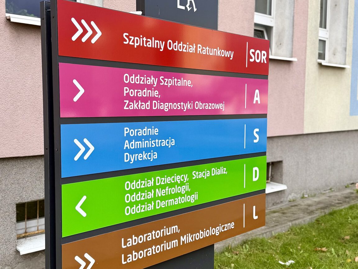 Nowe oznaczenia pojawiły się zarówno przy wejściu głównym, jak i w budynkach poradni. W głównym holu, tuż obok punktu informacji, zamontowano podświetlany pylon wskazujący kierunki do poszczególnych oddziałów. W budynku Poradni Specjalistycznych pojawiły się dodatkowe oznaczenia wewnętrzne, ułatwiające poruszanie się po piętrach.