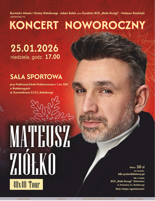 Mieszkańcy Białobrzegów i okolic będą mieli okazję rozpocząć nowy rok w muzycznym klimacie. Odbędzie się Koncert Noworoczny Mateusza Ziółko, cenionego wokalisty, kompozytora i pianisty, znanego z charyzmatycznych występów i wyjątkowej wrażliwości artystycznej.