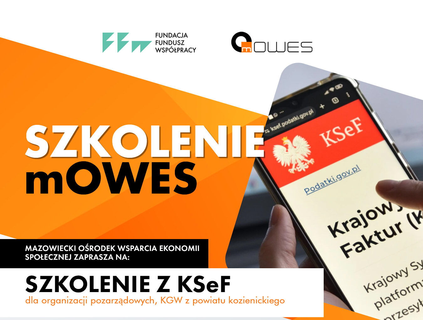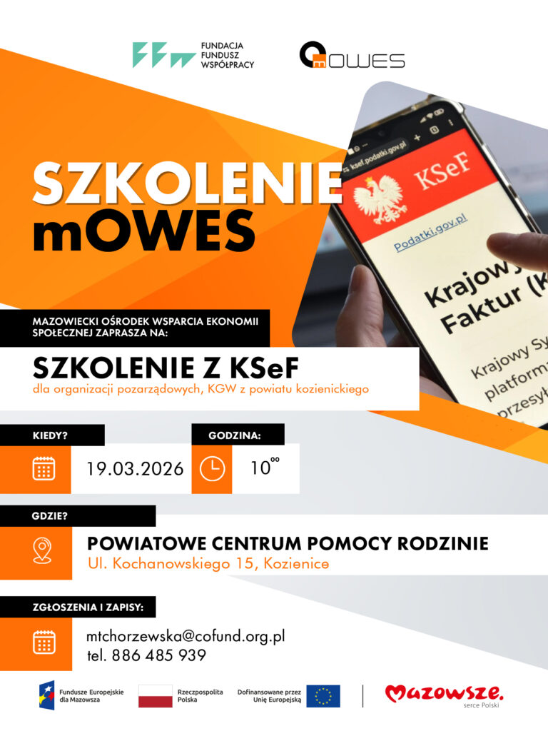 Mazowiecki Ośrodek Wsparcia Ekonomii Społecznej (Fundacja Fundusz Współpracy) kontynuuje cykl szkoleń z zakresu Krajowego Systemu e-Faktur. Już 19 marca w sali konferencyjnej PCPR odbędzie się bezpłatne spotkanie