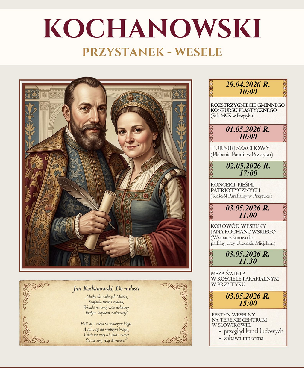 Miasto i Gmina Przytyk zapraszają na wydarzenie pod nazwą „Kochanowski: Przystanek – Wesele 2026”.